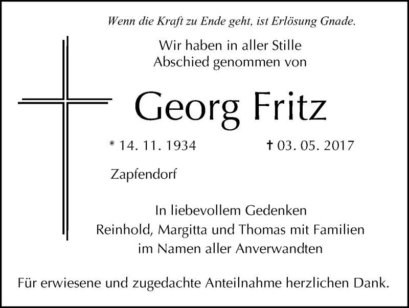 Hier finden Sie alle Traueranzeigen aus der Zeitung, die bisher für Georg Fritz erschienen sind. Weitere Traueranzeigen, die in der Zeitung erscheinen, werden hier ebenfalls aufgelistet