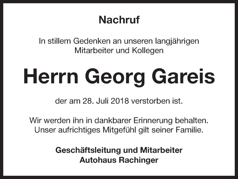 Hier finden Sie alle Traueranzeigen aus der Zeitung, die bisher für Georg Gareis erschienen sind. Weitere Traueranzeigen, die in der Zeitung erscheinen, werden hier ebenfalls aufgelistet