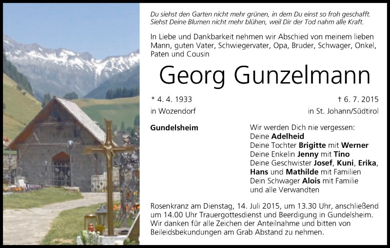 Hier finden Sie alle Traueranzeigen aus der Zeitung, die bisher für Georg Gunzelmann erschienen sind. Weitere Traueranzeigen, die in der Zeitung erscheinen, werden hier ebenfalls aufgelistet