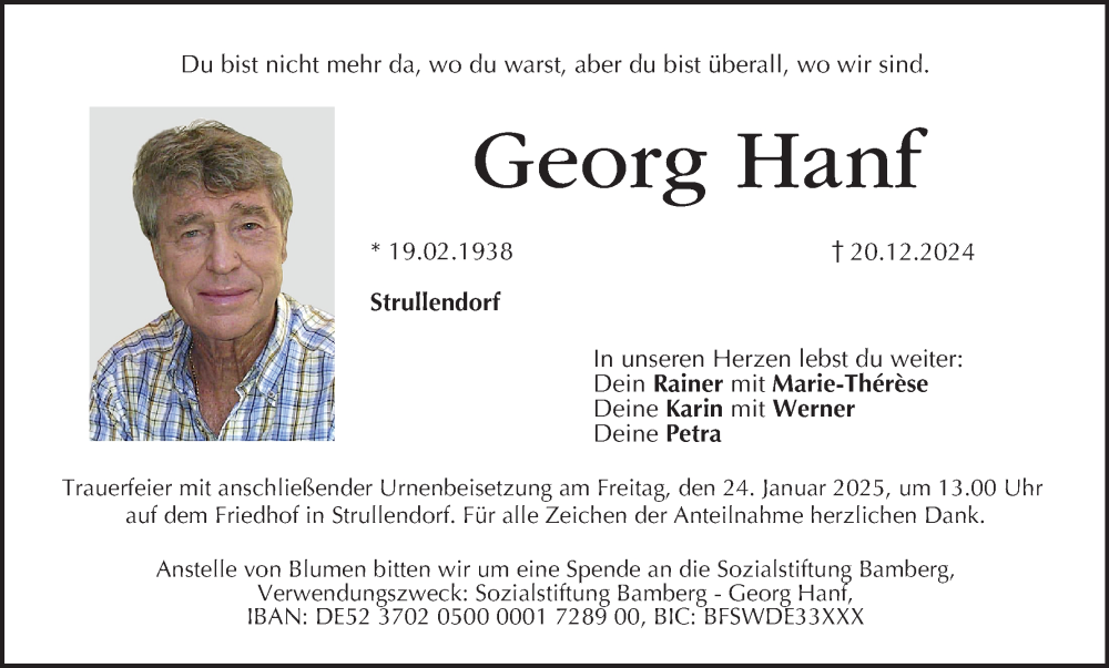 Hier finden Sie alle Traueranzeigen aus der Zeitung, die bisher für Georg Hanf erschienen sind. Weitere Traueranzeigen, die in der Zeitung erscheinen, werden hier ebenfalls aufgelistet