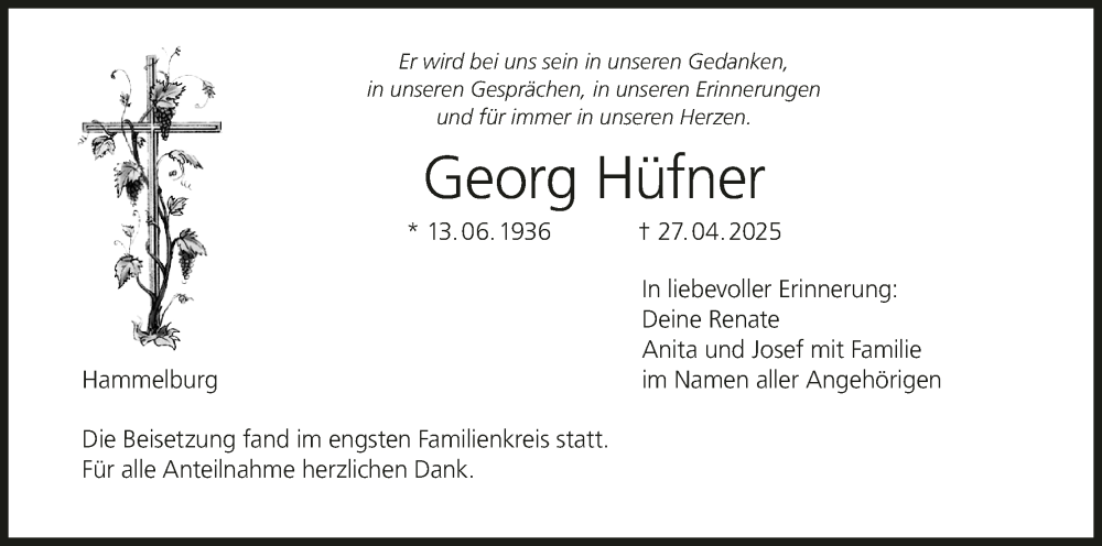 Hier finden Sie alle Traueranzeigen aus der Zeitung, die bisher für Georg Hüfner erschienen sind. Weitere Traueranzeigen, die in der Zeitung erscheinen, werden hier ebenfalls aufgelistet