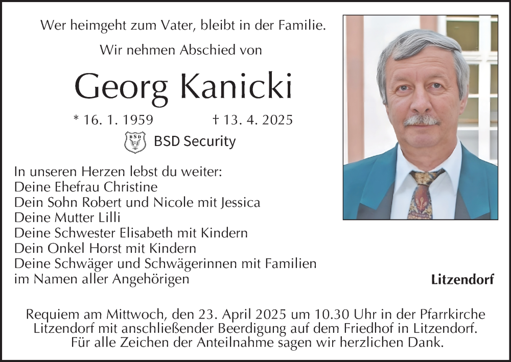 Hier finden Sie alle Traueranzeigen aus der Zeitung, die bisher für Georg Kanicki erschienen sind. Weitere Traueranzeigen, die in der Zeitung erscheinen, werden hier ebenfalls aufgelistet