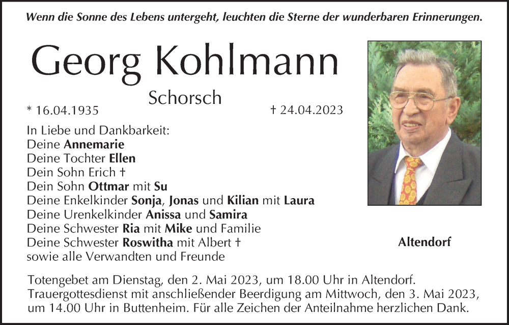 Hier finden Sie alle Traueranzeigen aus der Zeitung, die bisher für Georg Kohlmann erschienen sind. Weitere Traueranzeigen, die in der Zeitung erscheinen, werden hier ebenfalls aufgelistet