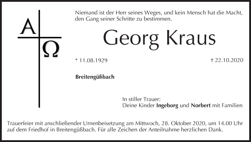 Hier finden Sie alle Traueranzeigen aus der Zeitung, die bisher für Georg Kraus erschienen sind. Weitere Traueranzeigen, die in der Zeitung erscheinen, werden hier ebenfalls aufgelistet