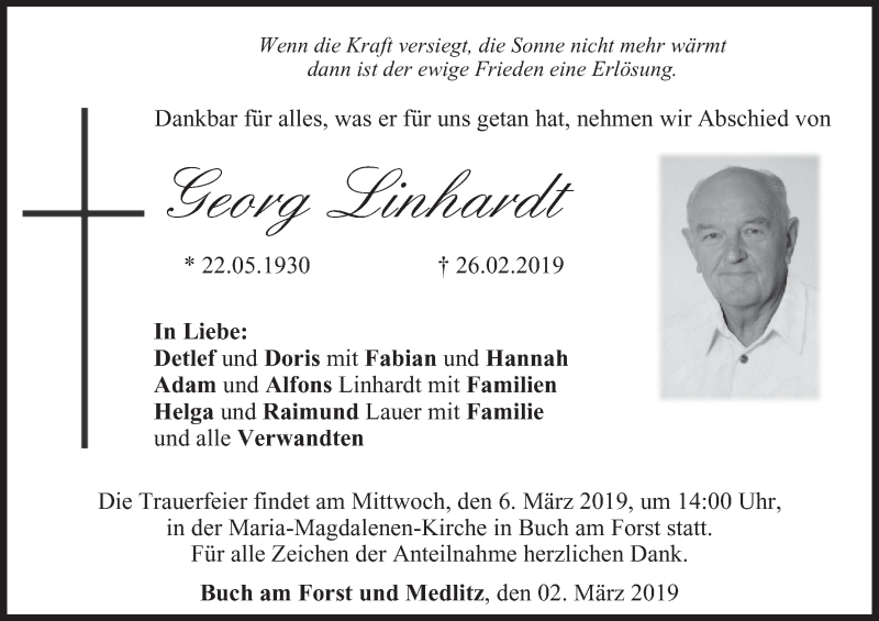 Hier finden Sie alle Traueranzeigen aus der Zeitung, die bisher für Georg Linhardt erschienen sind. Weitere Traueranzeigen, die in der Zeitung erscheinen, werden hier ebenfalls aufgelistet