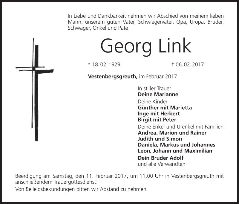 Hier finden Sie alle Traueranzeigen aus der Zeitung, die bisher für Georg Link erschienen sind. Weitere Traueranzeigen, die in der Zeitung erscheinen, werden hier ebenfalls aufgelistet