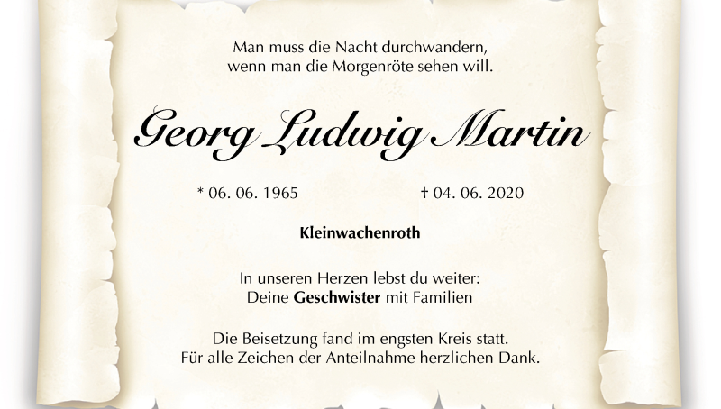 Hier finden Sie alle Traueranzeigen aus der Zeitung, die bisher für Georg Ludwig Martin erschienen sind. Weitere Traueranzeigen, die in der Zeitung erscheinen, werden hier ebenfalls aufgelistet