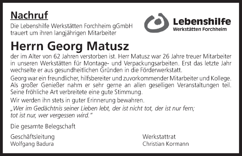 Hier finden Sie alle Traueranzeigen aus der Zeitung, die bisher für Georg Matusz erschienen sind. Weitere Traueranzeigen, die in der Zeitung erscheinen, werden hier ebenfalls aufgelistet