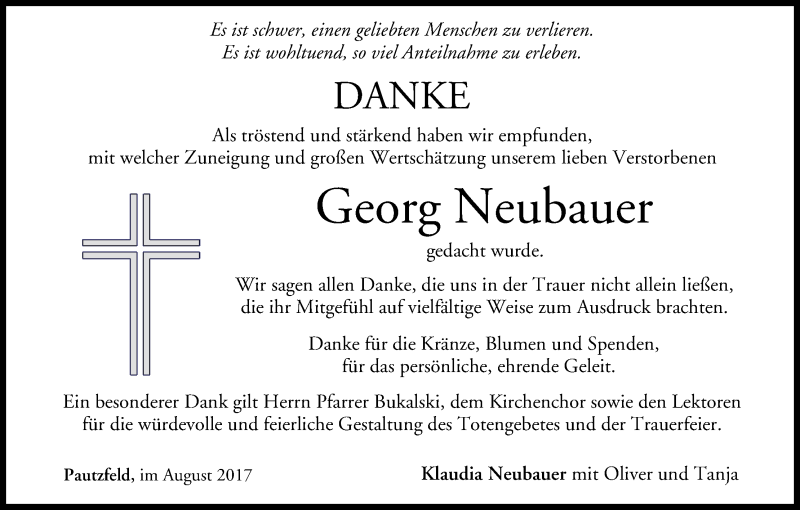 Hier finden Sie alle Traueranzeigen aus der Zeitung, die bisher für Georg Neubauer erschienen sind. Weitere Traueranzeigen, die in der Zeitung erscheinen, werden hier ebenfalls aufgelistet
