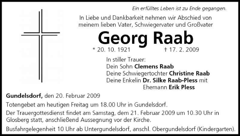 Hier finden Sie alle Traueranzeigen aus der Zeitung, die bisher für Georg Raab erschienen sind. Weitere Traueranzeigen, die in der Zeitung erscheinen, werden hier ebenfalls aufgelistet
