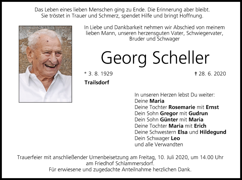 Hier finden Sie alle Traueranzeigen aus der Zeitung, die bisher für Georg Scheller erschienen sind. Weitere Traueranzeigen, die in der Zeitung erscheinen, werden hier ebenfalls aufgelistet