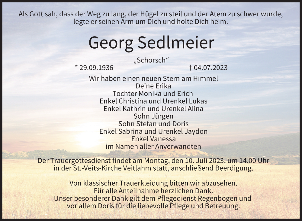 Hier finden Sie alle Traueranzeigen aus der Zeitung, die bisher für Georg Sedlmeier erschienen sind. Weitere Traueranzeigen, die in der Zeitung erscheinen, werden hier ebenfalls aufgelistet