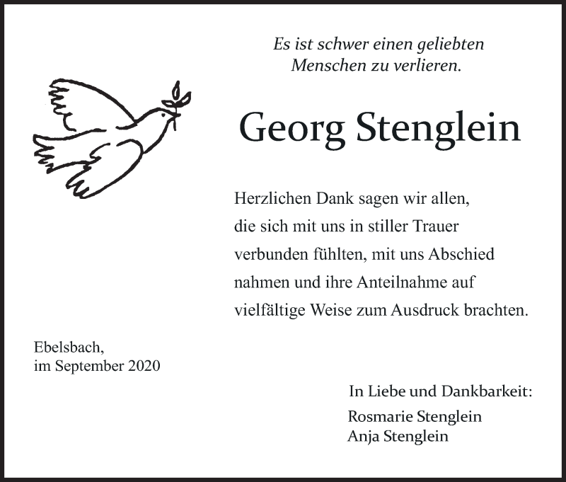Hier finden Sie alle Traueranzeigen aus der Zeitung, die bisher für Georg Stenglein erschienen sind. Weitere Traueranzeigen, die in der Zeitung erscheinen, werden hier ebenfalls aufgelistet