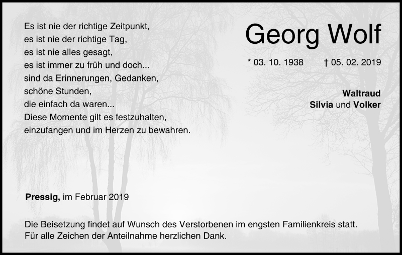 Hier finden Sie alle Traueranzeigen aus der Zeitung, die bisher für Georg Wolf erschienen sind. Weitere Traueranzeigen, die in der Zeitung erscheinen, werden hier ebenfalls aufgelistet