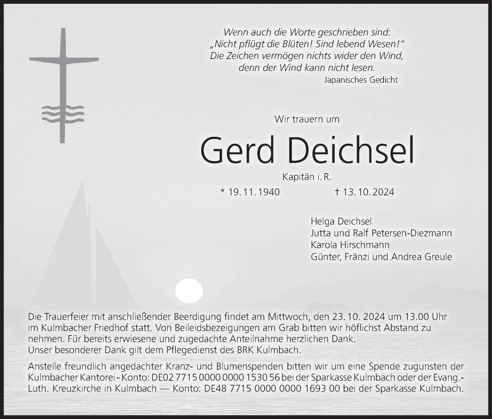 Hier finden Sie alle Traueranzeigen aus der Zeitung, die bisher für Gerd Deichsel erschienen sind. Weitere Traueranzeigen, die in der Zeitung erscheinen, werden hier ebenfalls aufgelistet