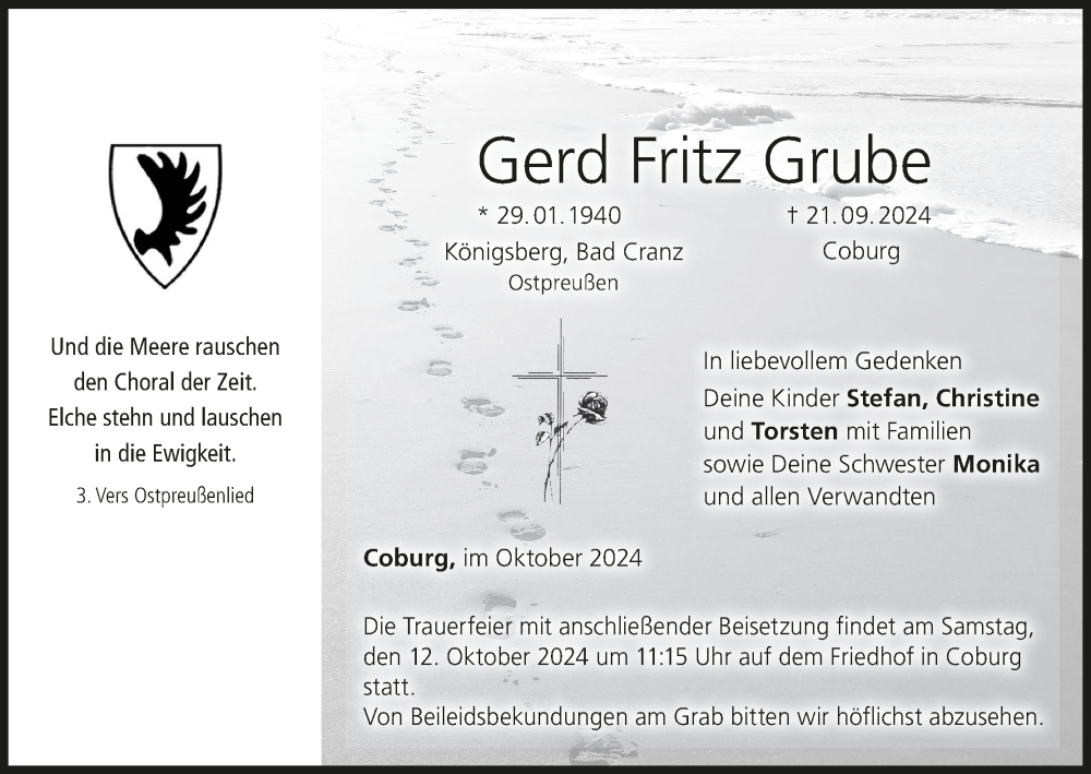 Hier finden Sie alle Traueranzeigen aus der Zeitung, die bisher für Gerd Fritz Grube erschienen sind. Weitere Traueranzeigen, die in der Zeitung erscheinen, werden hier ebenfalls aufgelistet