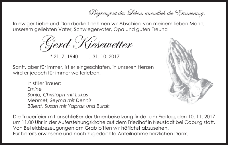 Hier finden Sie alle Traueranzeigen aus der Zeitung, die bisher für Gerd Kiesewetter erschienen sind. Weitere Traueranzeigen, die in der Zeitung erscheinen, werden hier ebenfalls aufgelistet