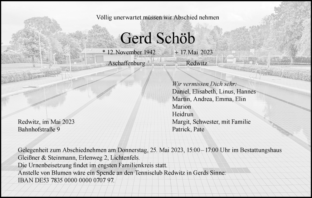 Hier finden Sie alle Traueranzeigen aus der Zeitung, die bisher für Gerd Schöb erschienen sind. Weitere Traueranzeigen, die in der Zeitung erscheinen, werden hier ebenfalls aufgelistet