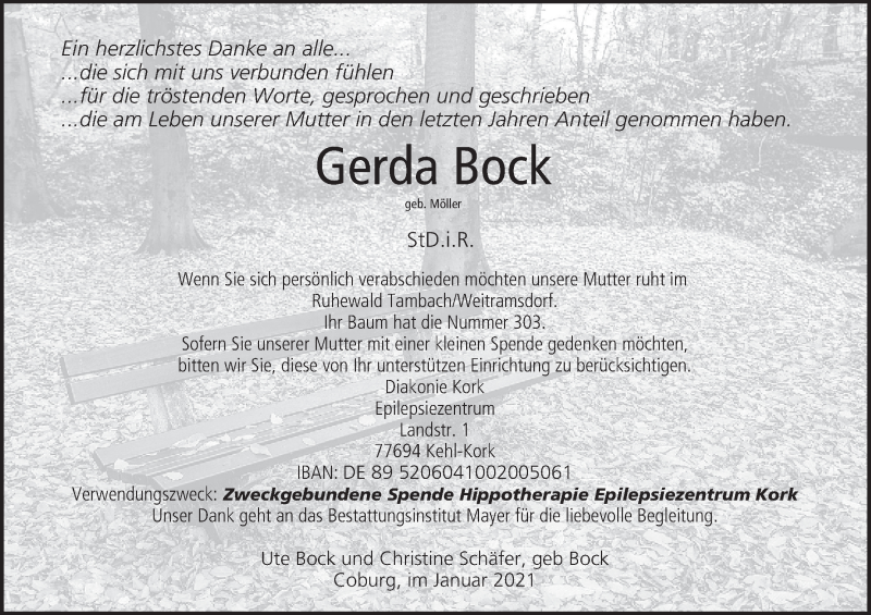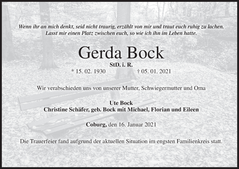 Hier finden Sie alle Traueranzeigen aus der Zeitung, die bisher für Gerda Bock erschienen sind. Weitere Traueranzeigen, die in der Zeitung erscheinen, werden hier ebenfalls aufgelistet