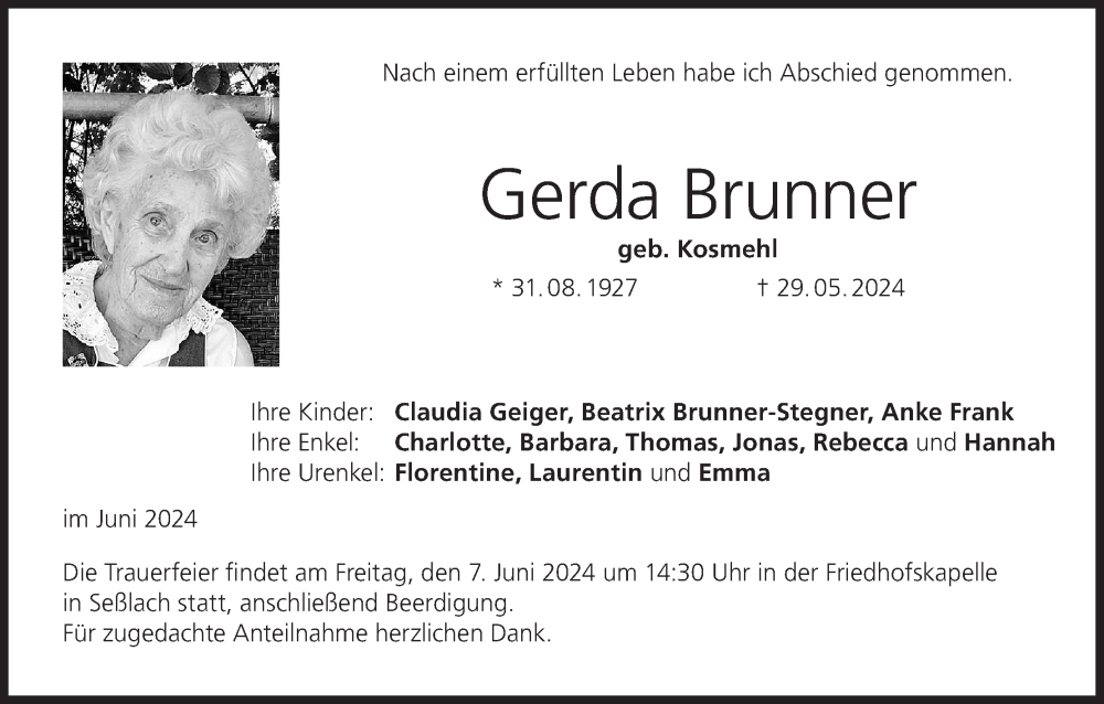 Hier finden Sie alle Traueranzeigen aus der Zeitung, die bisher für Gerda Brunner erschienen sind. Weitere Traueranzeigen, die in der Zeitung erscheinen, werden hier ebenfalls aufgelistet