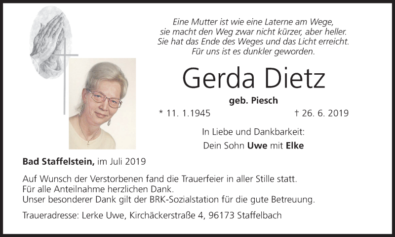 Hier finden Sie alle Traueranzeigen aus der Zeitung, die bisher für Gerda Dietz erschienen sind. Weitere Traueranzeigen, die in der Zeitung erscheinen, werden hier ebenfalls aufgelistet