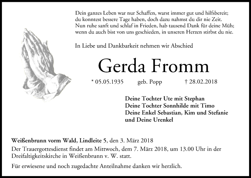 Hier finden Sie alle Traueranzeigen aus der Zeitung, die bisher für Gerda Fromm erschienen sind. Weitere Traueranzeigen, die in der Zeitung erscheinen, werden hier ebenfalls aufgelistet