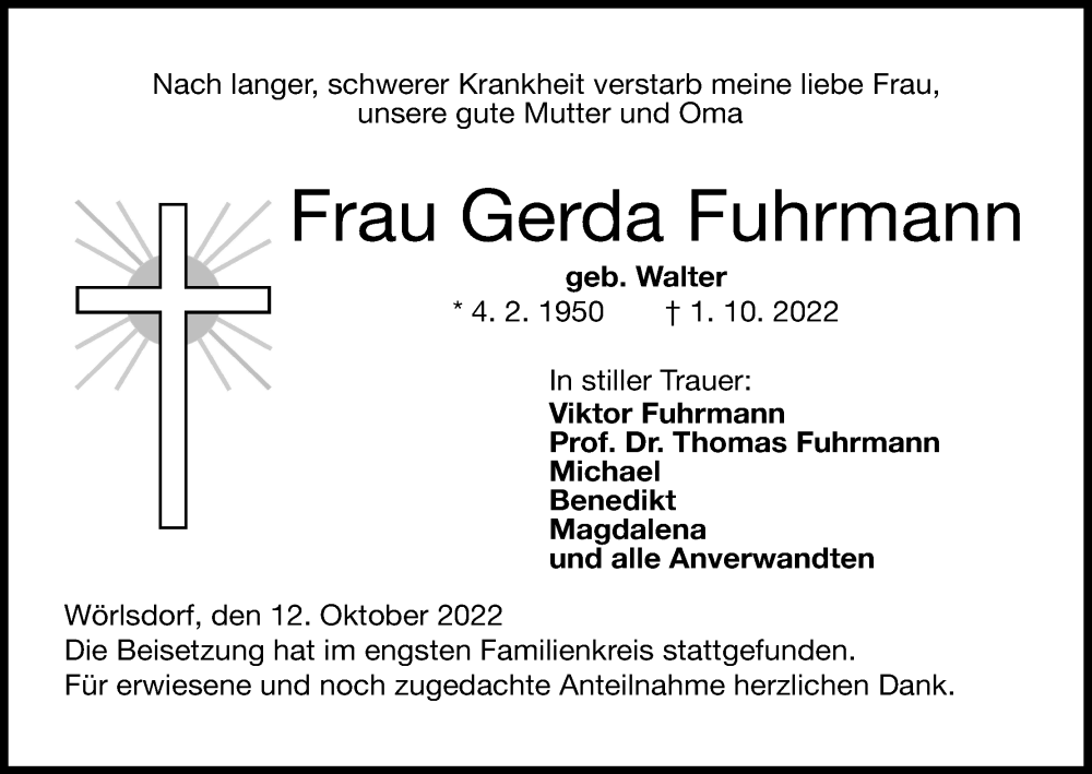 Hier finden Sie alle Traueranzeigen aus der Zeitung, die bisher für Gerda Fuhrmann erschienen sind. Weitere Traueranzeigen, die in der Zeitung erscheinen, werden hier ebenfalls aufgelistet