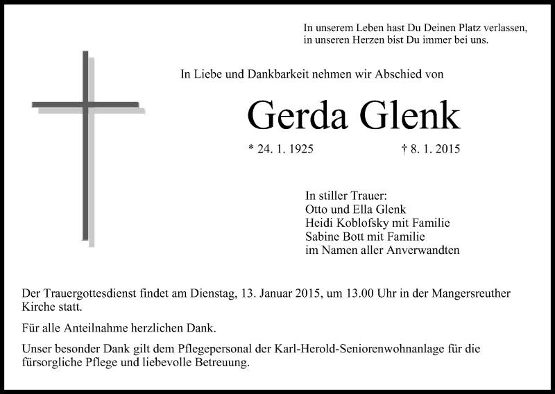 Hier finden Sie alle Traueranzeigen aus der Zeitung, die bisher für Gerda Glenk erschienen sind. Weitere Traueranzeigen, die in der Zeitung erscheinen, werden hier ebenfalls aufgelistet