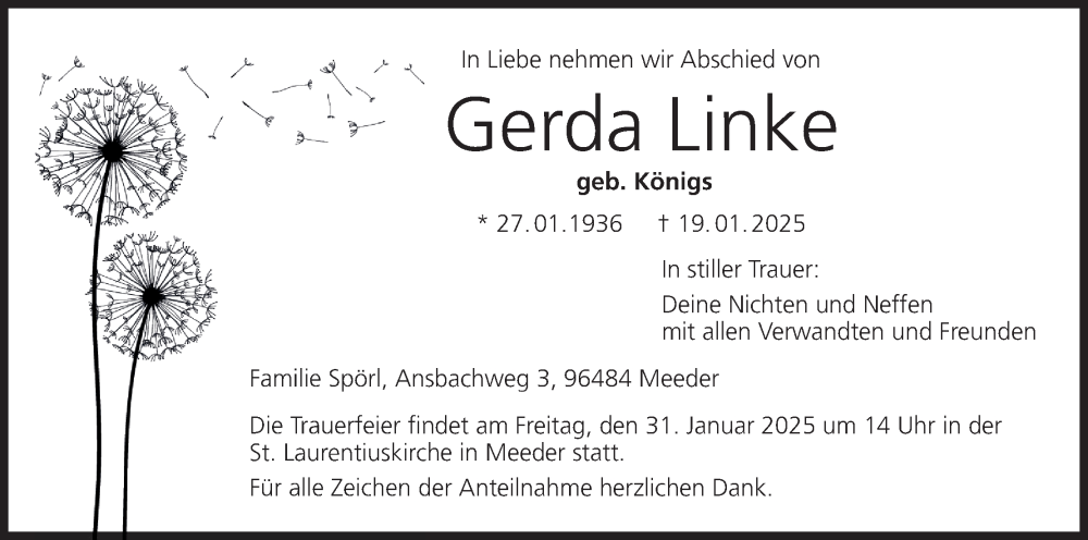 Hier finden Sie alle Traueranzeigen aus der Zeitung, die bisher für Gerda Linke erschienen sind. Weitere Traueranzeigen, die in der Zeitung erscheinen, werden hier ebenfalls aufgelistet
