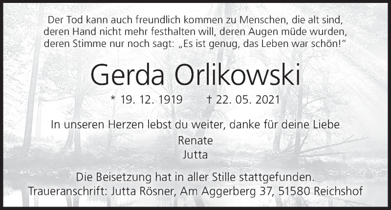 Hier finden Sie alle Traueranzeigen aus der Zeitung, die bisher für Gerda Orlikowski erschienen sind. Weitere Traueranzeigen, die in der Zeitung erscheinen, werden hier ebenfalls aufgelistet