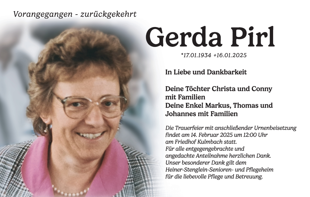 Hier finden Sie alle Traueranzeigen aus der Zeitung, die bisher für Gerda Pirl erschienen sind. Weitere Traueranzeigen, die in der Zeitung erscheinen, werden hier ebenfalls aufgelistet
