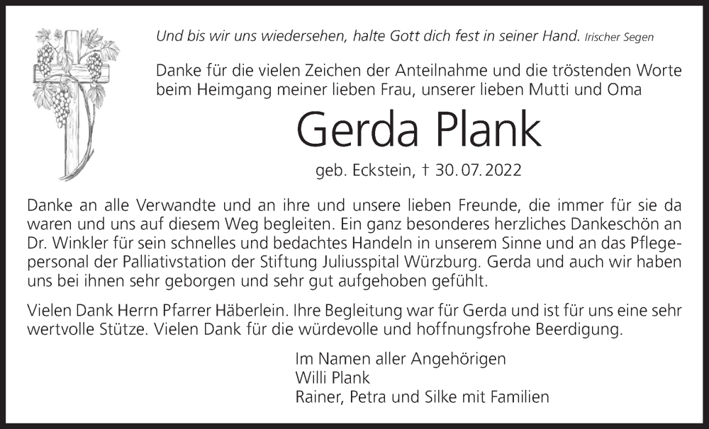 Hier finden Sie alle Traueranzeigen aus der Zeitung, die bisher für Gerda Plank erschienen sind. Weitere Traueranzeigen, die in der Zeitung erscheinen, werden hier ebenfalls aufgelistet