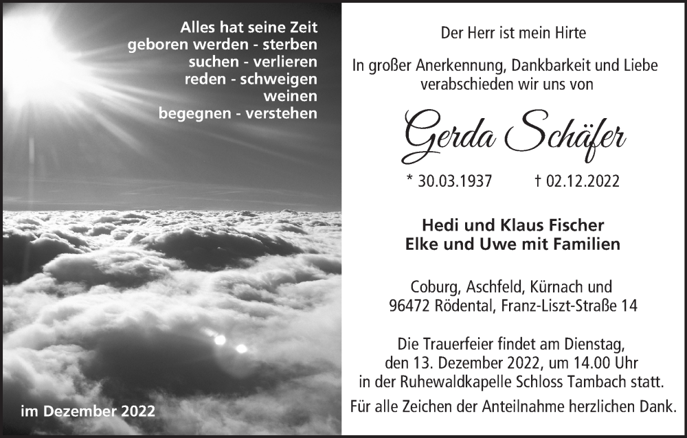 Hier finden Sie alle Traueranzeigen aus der Zeitung, die bisher für Gerda Schäfer erschienen sind. Weitere Traueranzeigen, die in der Zeitung erscheinen, werden hier ebenfalls aufgelistet