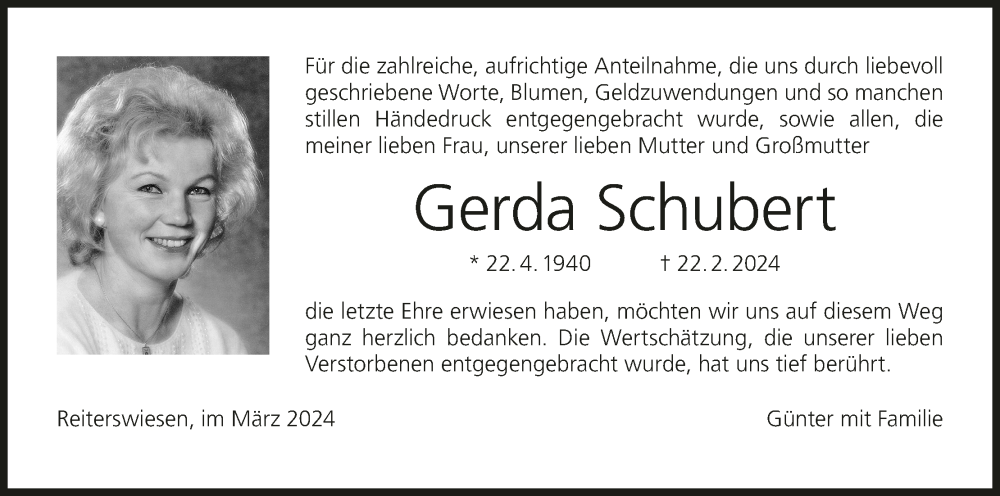 Hier finden Sie alle Traueranzeigen aus der Zeitung, die bisher für Gerda Schubert erschienen sind. Weitere Traueranzeigen, die in der Zeitung erscheinen, werden hier ebenfalls aufgelistet