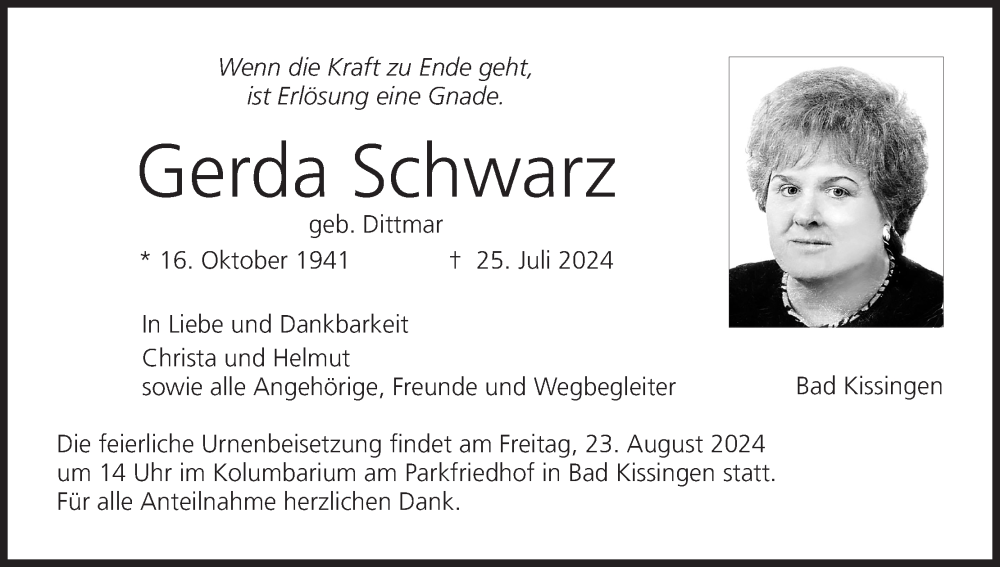 Hier finden Sie alle Traueranzeigen aus der Zeitung, die bisher für Gerda Schwarz erschienen sind. Weitere Traueranzeigen, die in der Zeitung erscheinen, werden hier ebenfalls aufgelistet
