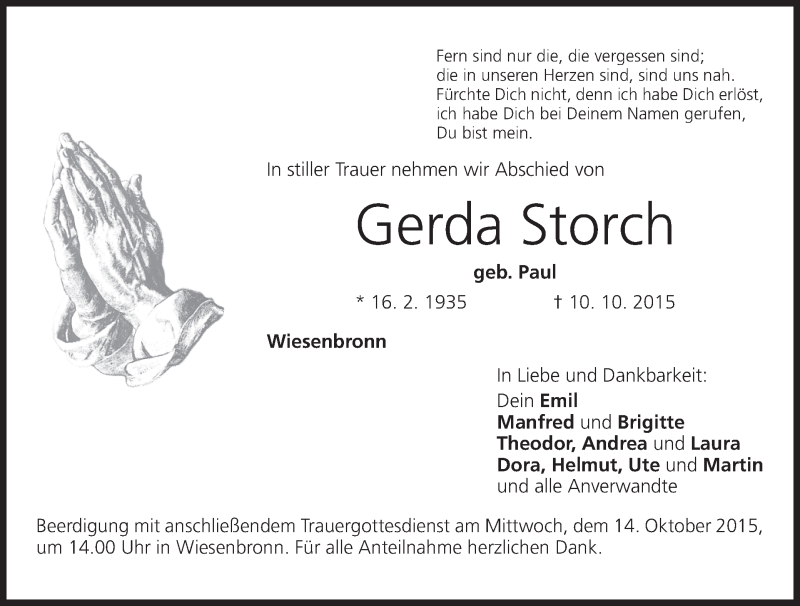 Hier finden Sie alle Traueranzeigen aus der Zeitung, die bisher für Gerda Storch erschienen sind. Weitere Traueranzeigen, die in der Zeitung erscheinen, werden hier ebenfalls aufgelistet
