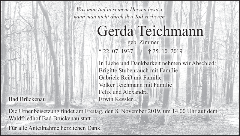 Hier finden Sie alle Traueranzeigen aus der Zeitung, die bisher für Gerda Teichmann erschienen sind. Weitere Traueranzeigen, die in der Zeitung erscheinen, werden hier ebenfalls aufgelistet