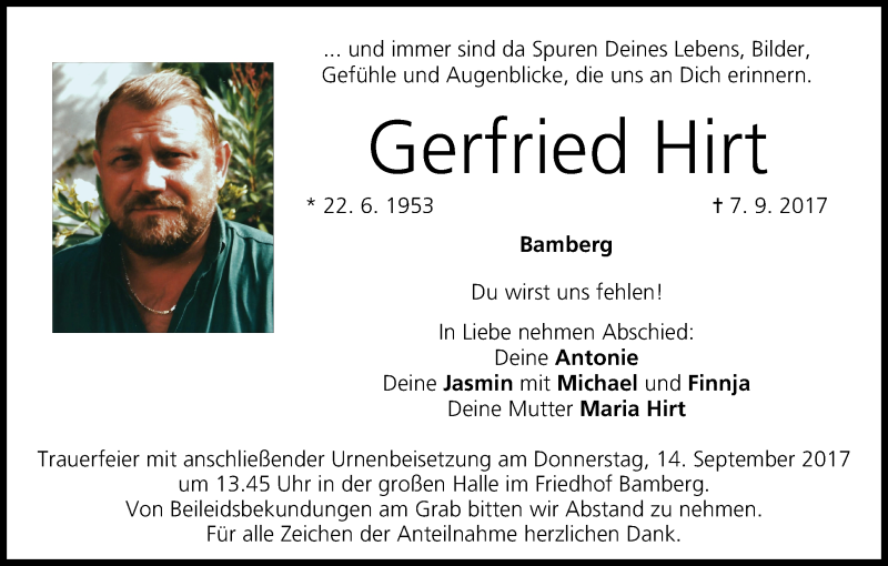 Hier finden Sie alle Traueranzeigen aus der Zeitung, die bisher für Gerfried Hirt erschienen sind. Weitere Traueranzeigen, die in der Zeitung erscheinen, werden hier ebenfalls aufgelistet