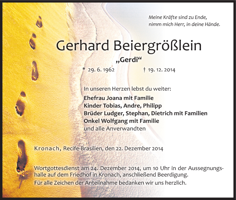 Hier finden Sie alle Traueranzeigen aus der Zeitung, die bisher für Gerhard Beiergrößlein erschienen sind. Weitere Traueranzeigen, die in der Zeitung erscheinen, werden hier ebenfalls aufgelistet
