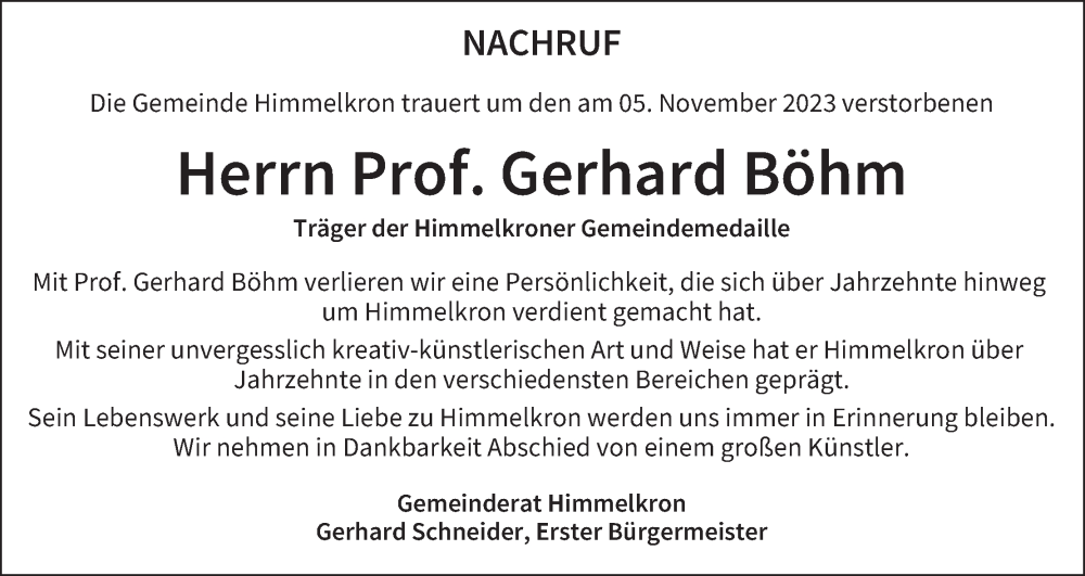 Hier finden Sie alle Traueranzeigen aus der Zeitung, die bisher für Gerhard Böhm erschienen sind. Weitere Traueranzeigen, die in der Zeitung erscheinen, werden hier ebenfalls aufgelistet