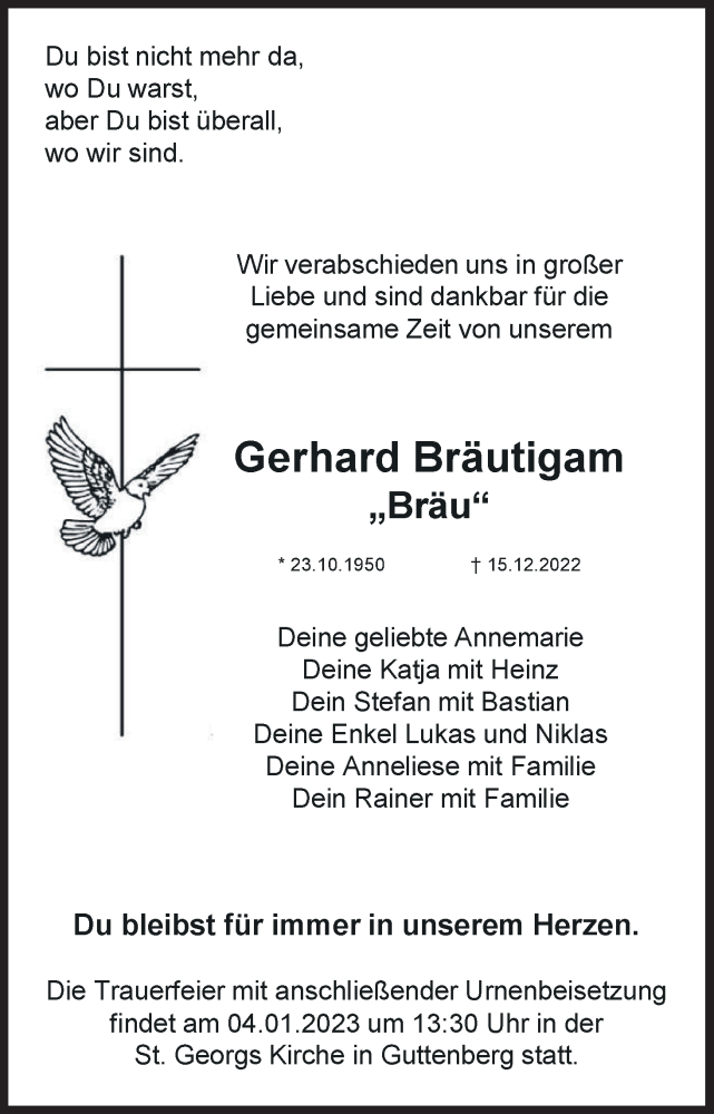 Hier finden Sie alle Traueranzeigen aus der Zeitung, die bisher für Gerhard Bräutigam „Bräu“ erschienen sind. Weitere Traueranzeigen, die in der Zeitung erscheinen, werden hier ebenfalls aufgelistet