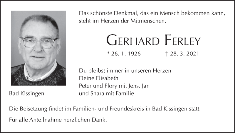 Hier finden Sie alle Traueranzeigen aus der Zeitung, die bisher für Gerhard Ferley erschienen sind. Weitere Traueranzeigen, die in der Zeitung erscheinen, werden hier ebenfalls aufgelistet