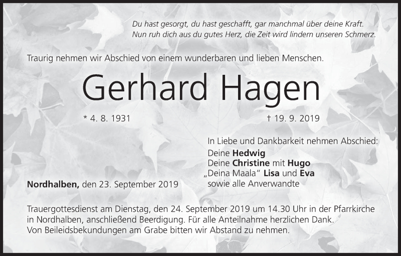 Hier finden Sie alle Traueranzeigen aus der Zeitung, die bisher für Gerhard Hagen erschienen sind. Weitere Traueranzeigen, die in der Zeitung erscheinen, werden hier ebenfalls aufgelistet