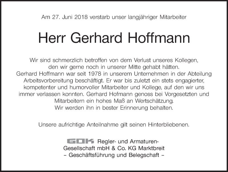 Hier finden Sie alle Traueranzeigen aus der Zeitung, die bisher für Gerhard Hoffmann erschienen sind. Weitere Traueranzeigen, die in der Zeitung erscheinen, werden hier ebenfalls aufgelistet