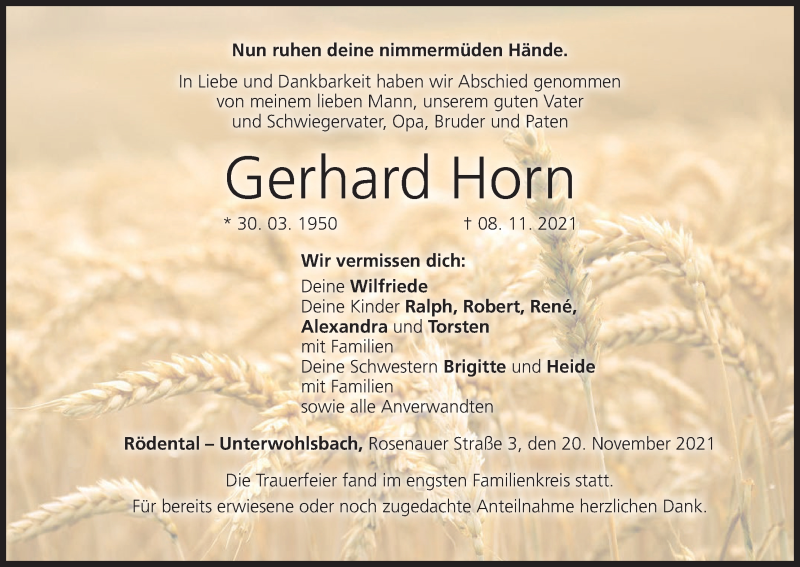 Hier finden Sie alle Traueranzeigen aus der Zeitung, die bisher für Gerhard Horn erschienen sind. Weitere Traueranzeigen, die in der Zeitung erscheinen, werden hier ebenfalls aufgelistet