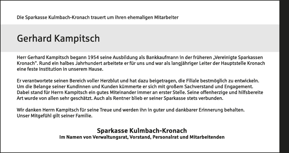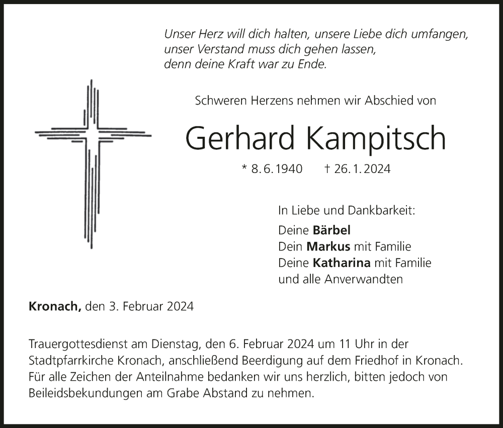 Hier finden Sie alle Traueranzeigen aus der Zeitung, die bisher für Gerhard Kampitsch erschienen sind. Weitere Traueranzeigen, die in der Zeitung erscheinen, werden hier ebenfalls aufgelistet
