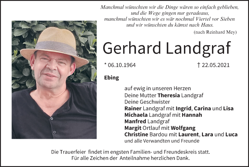 Hier finden Sie alle Traueranzeigen aus der Zeitung, die bisher für Gerhard Landgraf erschienen sind. Weitere Traueranzeigen, die in der Zeitung erscheinen, werden hier ebenfalls aufgelistet