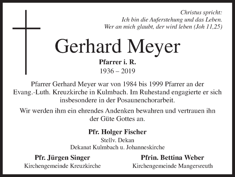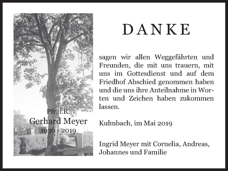 Hier finden Sie alle Traueranzeigen aus der Zeitung, die bisher für Gerhard Meyer erschienen sind. Weitere Traueranzeigen, die in der Zeitung erscheinen, werden hier ebenfalls aufgelistet