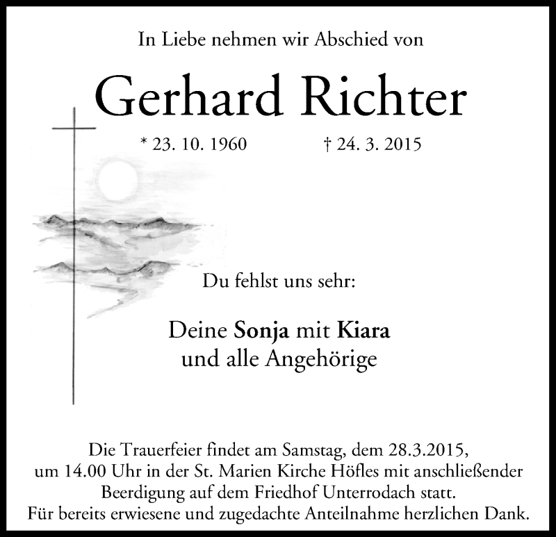 Hier finden Sie alle Traueranzeigen aus der Zeitung, die bisher für Gerhard Richter erschienen sind. Weitere Traueranzeigen, die in der Zeitung erscheinen, werden hier ebenfalls aufgelistet