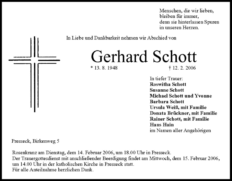 Hier finden Sie alle Traueranzeigen aus der Zeitung, die bisher für Gerhard Schott erschienen sind. Weitere Traueranzeigen, die in der Zeitung erscheinen, werden hier ebenfalls aufgelistet